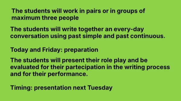 The students will present their role play and be evaluated for their partecipation in the writing process and for their performance. Timing: presentation next Tuesday