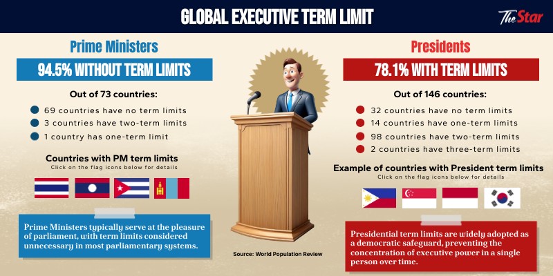 Prime Ministers typically serve at the pleasure of parliament, with term limits considered unnecessary in most parliamentary systems.