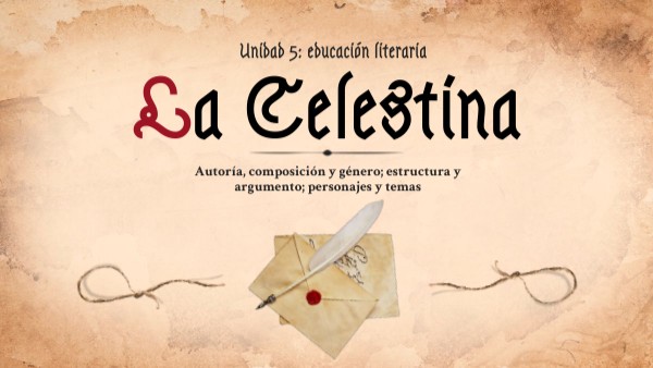AUTORÍA, GÉNERO Y COMPOSICIÓN-La Celestina es una obra fundamental de la literatura española.-Se sitúa en el tránsito entre la Edad Media y el Renacimiento. -Su autor es Fernando de Rojas. -Es una obra dialogada.