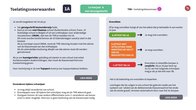 Als je een kunstgerichte opleiding wil starten in een school met enkel kunstsecundaire studierichtingen, dan moet de klassenraad hiervoor toestemming geven. Voor inschrijving in 1A met Topsport moet je een topsportstatuut hebben.Overzitten Of je mag overzitten hangt af van het attest dat je behaalde in een eerder 1e jaar.