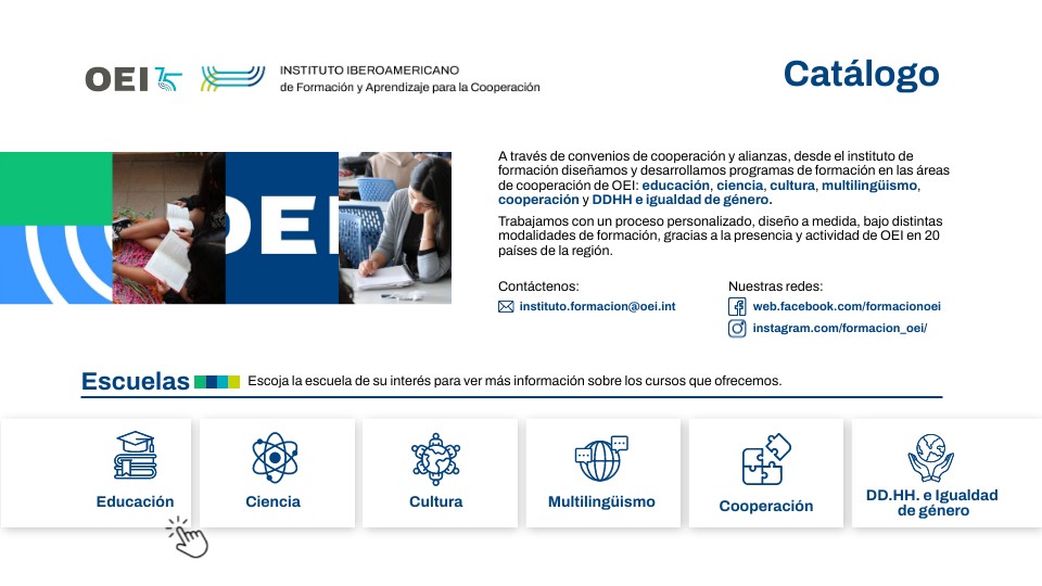 A través de convenios de cooperación y alianzas, desde el instituto de formación diseñamos y desarrollamos programas de formación en las áreas de cooperación de OEI: educación, ciencia, cultura, multilingüismo, cooperación y DDHH e igualdad de género.