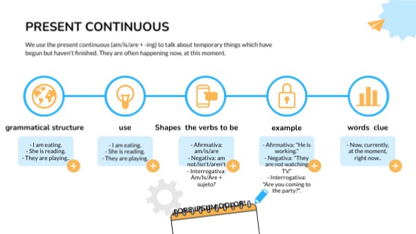 - Afirmativa: "He is working." - Negativa: "They are not watching TV." - Interrogativa: "Are you coming to the party?".