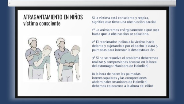 Si la víctima está consciente y respira, significa que tiene una obstrucción parcial: 1º Le animaremos enérgicamente a que tosa hasta que la obstrucción se solucione. 2º El reanimador inclina a la víctima hacia delante y sujetándola por el pecho le dará 5 palmadas para intentar la desobstrucción. 3º Si no se resuelve el problema deberemos realizar 5 compresiones bruscas en la boca del estómago (Maniobra de Heimlich) (A la hora de hacer las palmadas interescapulares y las compresiones abdominales (maniobra de Heimlich) debemos colocarnos a la altura del niño).