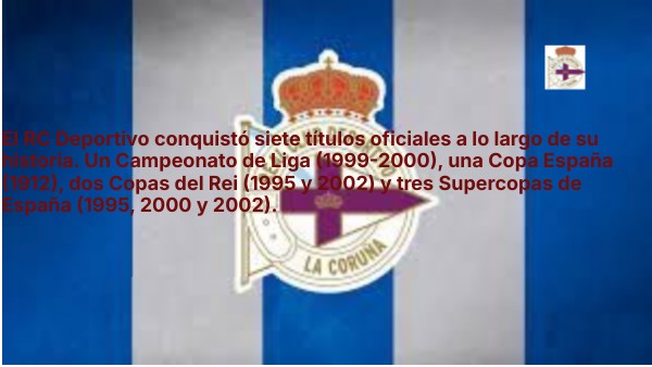 El RC Deportivo conquistó siete títulos oficiales a lo largo de su historia. Un Campeonato de Liga (1999-2000), una Copa España (1912), dos Copas del Rei (1995 y 2002) y tres Supercopas de España (1995, 2000 y 2002).