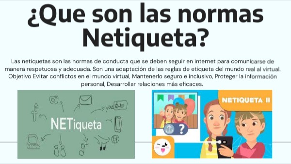 Las netiquetas son las normas de conducta que se deben seguir en internet para comunicarse de manera respetuosa y adecuada. Son una adaptación de las reglas de etiqueta del mundo real al virtual. Objetivo Evitar conflictos en el mundo virtual, Mantenerlo seguro e inclusivo, Proteger la información personal, Desarrollar relaciones más eficaces.
