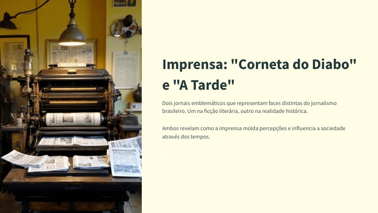 Esta apresentação visa analisar dois periódicos emblemáticos da época: "Corneta do Diabo" e "A Tarde". Examinaremos a identificação das personagens, a relação do episódio com a intriga principal, e a caracterização da vida cultural e política da vila retratada.
