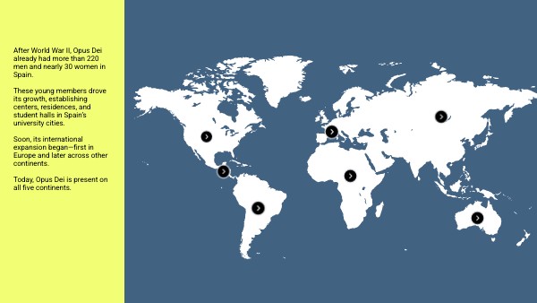 After World War II, Opus Dei already had more than 220 men and nearly 30 women in Spain. These young members drove its growth, establishing centers, residences, and student halls in Spain’s university cities. Soon, its international expansion began—first in Europe and later across other continents. Today, Opus Dei is present on all five continents.