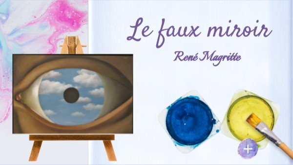 un immense œil humain pas de cils → tableau pas réaliste cercle noir( pupille) au centre → point puissant qui attire le regard le bleu du ciel et le blanc des nuages≠tons chauds de la peau contour sombre de l’œil≠la couleur bleue du ciel et le blanc des nuages. titre → ironique effet de profondeur→intrigue→impression d’être observé