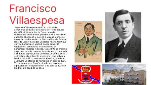 Francisco Villaespesa nació en la localidad almeriense de Laujar de Andarax el 15 de octubre de 1877.Inició estudios de Derecho en la Universidad de Granada, pero en 1897, a los veinte años, los abandonó y marchó a Málaga, donde se unió a la vida bohemia con Narciso Díaz de Escovar, Ricardo León y Salvador González Anaya. Continuó su vida bohemia en Madrid, donde subsistió dedicado al periodismo y colaborando en numerosas revistas y diarios.Hacia 1898 se imprimió su primer libro de poemas, Intimidades, y conocería a su futura esposa, Elisa González Columbio.En 1917 se trasladó al continente americano, para volver a Madrid hacia 1921; retornaría a América, donde le sobrevino un ataque de hemiplejía en abril de 1931. Volvió entonces a España, donde sus males se agravaron en 1933; falleció el 9 de abril de 1936 en Madrid, a la edad de 58 años.