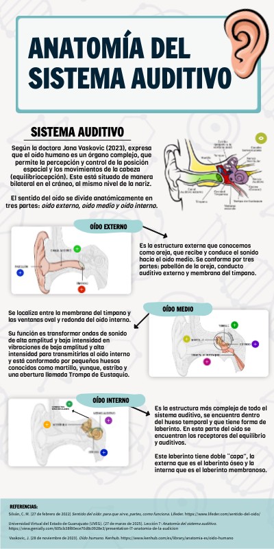 Silván, C. M. (27 de febrero de 2022) Sentido del oído: para que sirve, partes, como funciona. Lifeder. https://www.lifeder.com/sentido-del-oido/ Universidad Virtual del Estado de Guanajuato (UVEG). (27 de marzo de 2025). Lección 7: Anatomía del sistema auditivo. https://view.genially.com/605cb38f80ece70d8c0928e3/presentation-l7-anatomia-de-la-audicion Vaskovic, J. (28 de noviembre de 2023). Oído humano. Kenhub. https://www.kenhub.com/es/library/anatomia-es/oido-humano