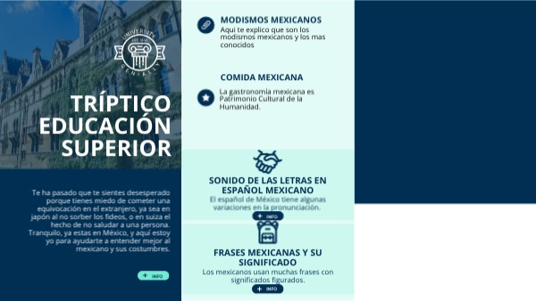 México tiene un español muy rico en expresiones coloquiales. Aquí algunos modismos populares: • Chido → Algo genial o bueno (Ese concierto estuvo chido). • Órale → Expresión de asombro, acuerdo o ánimo (¡Órale! Qué padre). • Neta → Se usa para confirmar la verdad de algo (¿Neta? = “¿De verdad?”). • Chamba → Trabajo (Consiguió una chamba nueva). • Cuate → Amigo (Voy con mi cuate al cine). • Fresa → Persona de clase alta o con actitudes arrogantes (Ese tipo es bien fresa). • Aguas → Advertencia de peligro (¡Aguas! Viene un coche). Tip: Agregar ilustraciones o íconos que representen cada expresión puede hacer más atractivo el folleto.