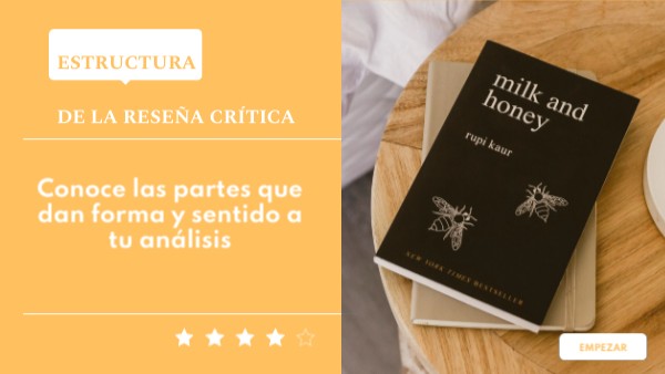La reseña crítica se organiza en cinco partes principales. Cada una tiene un propósito específico y todas juntas logran un texto coherente, sólido y argumentativo.
