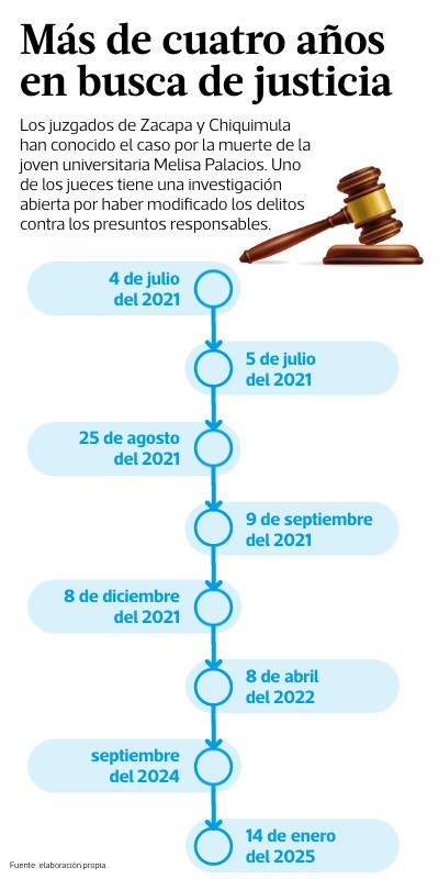 Los juzgados de Zacapa y Chiquimula han conocido el caso por la muerte de la joven universitaria Melisa Palacios. Uno de los jueces tiene una investigación abierta por haber modificado los delitos contra los presuntos responsables.