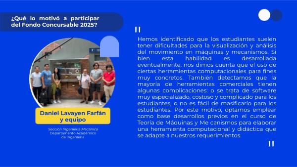 En la elaboración de una herramienta computacional para que los alumnos puedan visualizar y experimentar con distintas configuraciones geométricas de mecanismos, analizar y ver su movimiento y la influencia de distintos parámetros geométricos. En el curso de teoría de máquinas y mecanismos ya enseñamos a los estudiantes a usar las herramientas comerciales y hasta a desarrollar sus propias herramientas básicas; sin embargo, este curso es un electivo del final de carrera. Con este proyecto, pretendemos poner estas herramientas al alcance de más alumnos, de manera didáctica e ilustrativa.