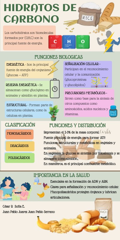 Representan el 2-3% de la masa corporal.Fuente principal de energía para formar ATP. Funciones estructurales y metabólicas en vegetales y animales. En vegetales, la glucosa se sintetiza por fotosíntesis y se almacena como almidón., En mamíferos, es el principal combustible metabólico.