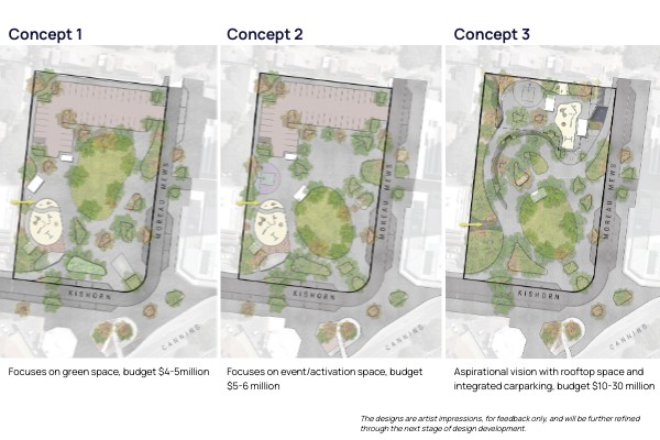 *Concept 3 builds on Concept 2, delivering an interim play space with key design features. A two-storey car park with rooftop play space would be staged for future development alongside surrounding projects.