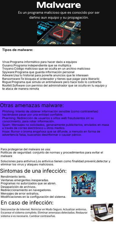 Virus:Programa informático para hacer daós a equipos Gusano:Programa independiente que se multiplica Troyano:Código malicioso que se oculta en un archivo malicioso Spyware:Programa que guarda información personal Adware:Usa tu historial para ponerte anuncios que te interesen Ransomware:Te bloquea el ordenador y tienes que pagar para liberarlo Rogue:Programa que simula un antimalware pero hace todo lo contrartio Rootkit:Software con permiso del administrador que se oculta en tu equipo y te ataca de manera remota