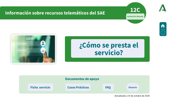 El servicio “12C Información sobre recursos telemáticos del SAE” se ofrece durante la Acogida de la Entrevista de Orientación Inicial, con el objetivo de promover el uso de los servicios telemáticos del SAE y facilitar una gestión autónoma y eficiente desde el primer contacto con la persona usuaria. Es esencial que, en este proceso de acogida, las personas demandantes de servicios de empleo descarguen la APP del SAE si aún no la tienen instalada, para asegurar un acceso ágil y efectivo a los recursos digitales disponibles.