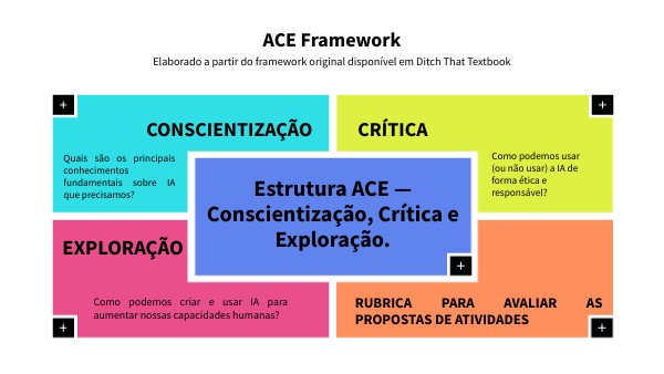 Desenvolvida por Matt Miller e Holly Clark, com base em pesquisas e diretrizes da UNESCO e do Departamento de Educação dos EUA, a Estrutura ACE é um modelo prático para integrar a literacia em IA à sua prática pedagógica.