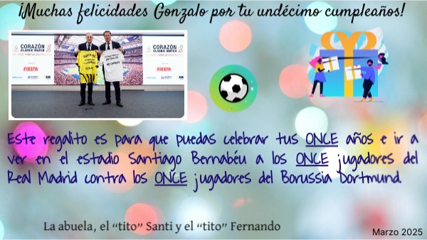 Este regalito es para que puedas celebrar tus ONCE años e ir a ver en el estadio Santiago Bernabéu a los ONCE jugadores del Real Madrid contra los ONCE jugadores del Borussia Dortmund.