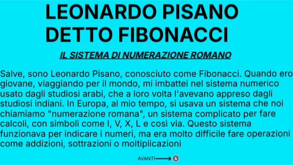 Salve, sono Leonardo Pisano, conosciuto come Fibonacci. Quando ero giovane, viaggiando per il mondo, mi imbattei nel sistema numerico usato dagli studiosi arabi, che a loro volta l'avevano appreso dagli studiosi indiani. In Europa, al mio tempo, si usava un sistema che noi chiamiamo "numerazione romana", un sistema complicato per fare calcoli, con simboli come I, V, X, L e così via. Questo sistema funzionava per indicare i numeri, ma era molto difficile fare operazioni come addizioni, sottrazioni o moltiplicazioni