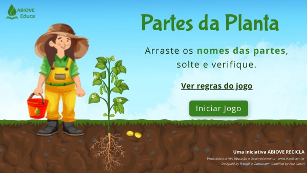 Objetivo: identificar corretamente as partes da soja. Como jogar: 1. Os nomes das 7 partes da soja são apresentados em uma coluna à esquerda, contendo: raiz, caule, ramo, folha, flor, fruto e semente. 2. A imagem da soja é apresentada à direita, junto com retângulos que deverão ser preenchidos com os nomes de suas partes correspondentes. 3. O jogador clica com o botão esquerdo do mouse no nome da parte da soja que está pulsando (à esquerda), mantendo-o pressionado e arrastando-o até o seu retângulo correpondente (à direita). 4. Jogador clica em "verificar". Se estiver acertado, o jogador é direcionado para seguir adiante, associando uma nova parte da soja ao seu retângulo correspondente, se estiver errado, o jogador poderá tentar novamente, até acertar. 5. O jogo termina quando todos os retângulos estiverem preenchidos.