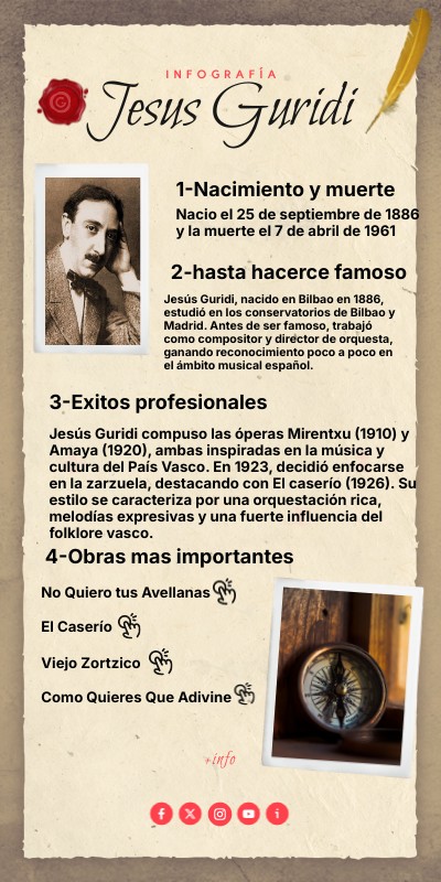 Jesús Guridi, nacido en Bilbao en 1886, estudió en los conservatorios de Bilbao y Madrid. Antes de ser famoso, trabajó como compositor y director de orquesta, ganando reconocimiento poco a poco en el ámbito musical español.