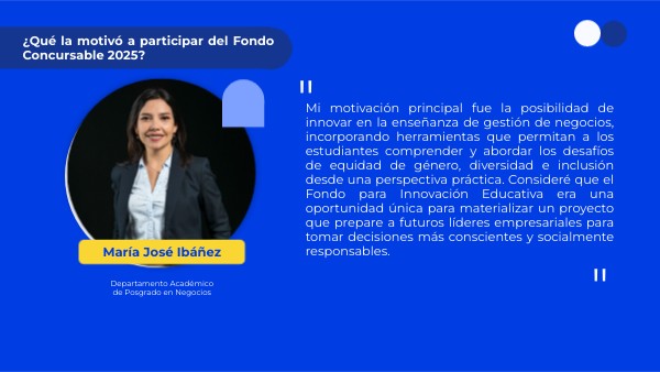 Mi motivación principal fue la posibilidad de innovar en la enseñanza de gestión de negocios, incorporando herramientas que permitan a los estudiantes comprender y abordar los desafíos de equidad de género, diversidad e inclusión desde una perspectiva práctica. Consideré que el Fondo para Innovación Educativa era una oportunidad única para materializar un proyecto que prepare a futuros líderes empresariales para tomar decisiones más conscientes y socialmente responsables.
