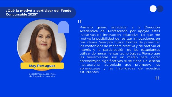 Primero quiero agradecer a la Dirección Académica del Profesorado por apoyar estas iniciativas de innovación educativa. Lo que me motivó la posibilidad de realizar innovaciones en mis clases. Siempre busco formas de presentar los contenidos de manera creativa y de motivar el interés y la participación de los estudiantes utilizando herramientas tecnológicas. Pienso que las herramientas son un medio para lograr aprendizajes significativos si se tiene un diseño instruccional apropiado que promueva los aprendizajes y las habilidades de nuestros estudiantes.