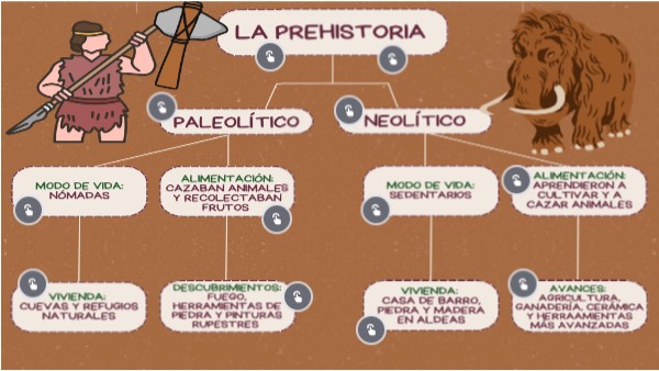 Esquema interactivo de los rasgos más destacables del paleolítico y del neolítico para 3º de Educación Primaria.