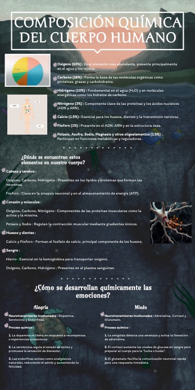 Oxígeno (65%) : Es el elemento más abundante, presente principalmente en el agua y los tejidos. Carbono (18%) : Forma la base de las moléculas orgánicas como proteínas, grasas y carbohidratos. Hidrógeno (10%) : Fundamental en el agua (H₂O) y en moléculas energéticas como los hidratos de carbono. Nitrógeno (3%) : Componente clave de las proteínas y los ácidos nucleicos (ADN y ARN). Calcio (1.5%) : Esencial para los huesos, dientes y la transmisión nerviosa. Fósforo (1%) : Presente en el ADN, ARN y en la estructura ósea. Potasio, Azufre, Sodio, Magnesio y otros oligoelementos (1.5%) : Participan en funciones metabólicas y reguladoras.