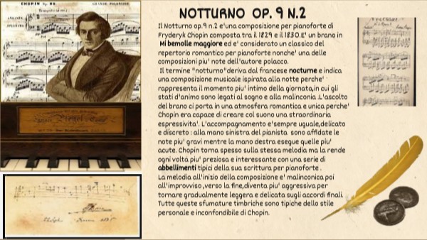 Il Notturno op.9 n.2 e'una composizione per pianoforte di Fryderyk Chopin composta tra il 1829 e il 1830.E' un brano in Mi bemolle maggiore ed e' considerato un classico del repertorio romantico per pianoforte nonche' una delle composizioni piu' note dell'autore polacco. Il termine "notturno"deriva dal francese nocturne e indica una composizione musicale ispirata alla notte perche' rappresenta il momento piu' intimo della giornata,in cui gli stati d'animo sono legati al sogno e alla malinconia .L'ascolto del brano ci porta in una atmosfera romantica e unica perche' Chopin era capace di creare col suono una straordinaria espressivita'. L'accompagnamento e'sempre uguale,delicato e discreto : alla mano sinistra del pianista sono affidate le note piu' gravi mentre la mano destra esegue quelle piu' acute. Chopin torna spesso sulla stessa melodia ma la rende ogni volta piu' preziosa e interessante con una serie di abbellimenti tipici della sua scrittura per pianoforte . La melodia all'inizio della composizione e' malinconica poi all'improvviso ,verso la fine,diventa piu' aggressiva per tornare gradualmente leggera e delicata sugli accordi finali. Tutte queste sfumature timbriche sono tipiche dello stile personale e inconfondibile di Chopin.
