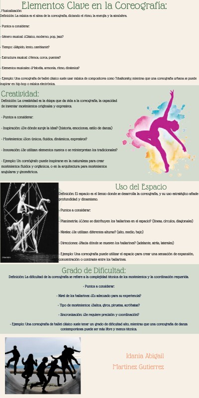 . Musicalización:Definición: La música es el alma de la coreografía, dictando el ritmo, la energía y la atmósfera. - Puntos a considerar: - Género musical: ¿Clásico, moderno, pop, jazz? - Tiempo: ¿Rápido, lento, cambiante? - Estructura musical: ¿Versos, coros, puentes? - Elementos musicales: ¿Melodía, armonía, ritmo, dinámica? - Ejemplo: Una coreografía de ballet clásico suele usar música de compositores como Tchaikovsky, mientras que una coreografía urbana se puede inspirar en hip-hop o música electrónica.