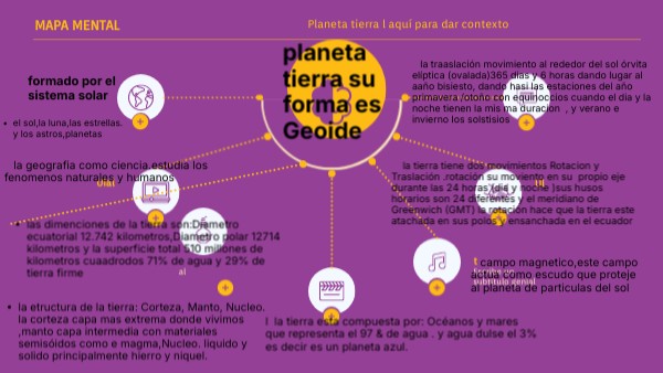 la tierra tiene dos movimientos Rotacion y Traslación .rotación su moviento en su propio eje durante las 24 horas (dia y noche )sus husos horarios son 24 diferentes y el meridiano de Greenwich (GMT) la rotación hace que la tierra este atachada en sus polos y ensanchada en el ecuador