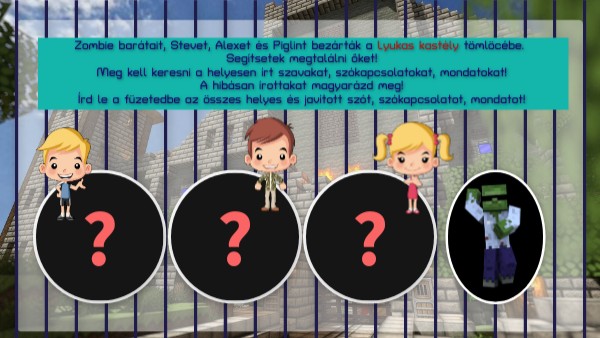 Zombie barátait, Stevet, Alexet és Piglint bezárták a Lyukas kastély tömlöcébe. Segítsetek megtalálni őket! Meg kell keresni a helyesen írt szavakat, szókapcsolatokat, mondatokat! A hibásan írottakat magyarázd meg! Írd le a füzetedbe az összes helyes és javított szót, szókapcsolatot, mondatot!
