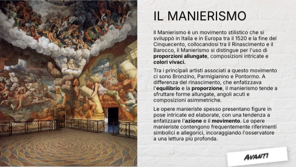 Il Manierismo è un movimento stilistico che si sviluppò in Italia e in Europa tra il 1520 e la fine del Cinquecento, collocandosi tra il Rinascimento e il Barocco, il Manierismo si distingue per l'uso di proporzioni allungate, composizioni intricate e colori vivaci. Tra i principali artisti associati a questo movimento ci sono Bronzino, Parmigianino e Pontormo. A differenza del rinascimento, che enfatizzava l'equilibrio e la proporzione, il manierismo tende a sfruttare forme allungate, angoli acuti e composizioni asimmetriche. Le opere manieriste spesso presentano figure in pose intricate ed elaborate, con una tendenza a enfatizzare l'azione e il movimento. Le opere manieriste contengono frequentemente riferimenti simbolici e allegorici, incoraggiando l'osservatore a una lettura più profonda.