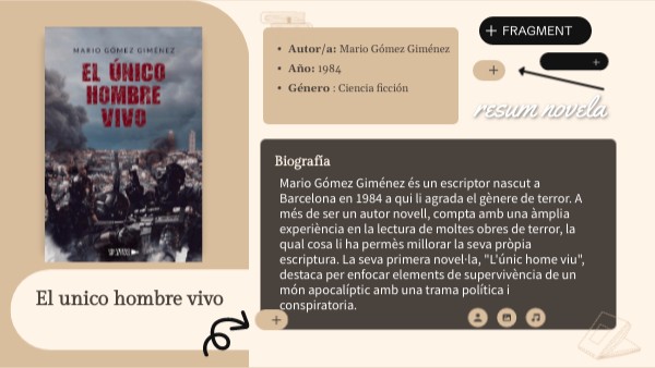 Mario Gómez Giménez és un escriptor nascut a Barcelona en 1984 a qui li agrada el gènere de terror. A més de ser un autor novell, compta amb una àmplia experiència en la lectura de moltes obres de terror, la qual cosa li ha permès millorar la seva pròpia escriptura. La seva primera novel·la, "L'únic home viu", destaca per enfocar elements de supervivència de un món apocalíptic amb una trama política i conspiratoria.