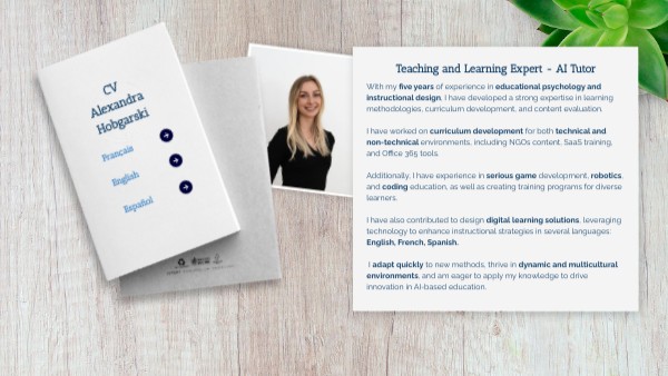 With my five years of experience in educational psychology and instructional design, I have developed a strong expertise in learning methodologies, curriculum development, and content evaluation. I have worked on curriculum development for both technical and non-technical environments, including NGOs content, SaaS training, and Office 365 tools. Additionally, I have experience in serious game development, robotics, and coding education, as well as creating training programs for diverse learners. I have also contributed to design digital learning solutions, leveraging technology to enhance instructional strategies in several languages: English, French, Spanish. I adapt quickly to new methods, thrive in dynamic and multicultural environments, and am eager to apply my knowledge to drive innovation in AI-based education.
