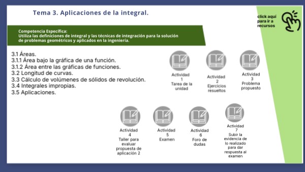 3.1 Áreas. 3.1.1 Área bajo la gráfica de una función. 3.1.2 Área entre las gráficas de funciones. 3.2 Longitud de curvas. 3.3 Cálculo de volúmenes de sólidos de revolución. 3.4 Integrales impropias. 3.5 Aplicaciones.