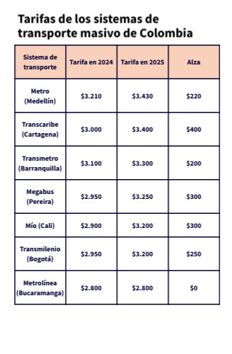 Tarifas de los sistemas de transporte masivo de Colombia