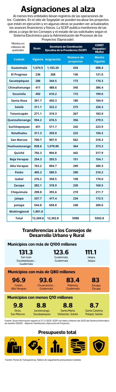 Al menos tres entidades llevan registros de las operaciones de losCodedes. En el sitio de Segeplán se pueden localizar los proyectos que están en ejecución y en algunas obras se pueden ver actualizados los avances financieros y físicos. La SCEP publica monitoreos de las obras a cargo de los Consejos y el estado de las solicitudes según el Sistema Electrónico para la Administración de Procesos de los Proyectos (Siprocode).