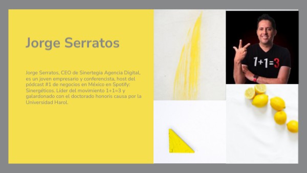Jorge Serratos, CEO de Sinertegia Agencia Digital, es un joven empresario y conferencista, host del pódcast #1 de negocios en México en Spotify: Sinergéticos. Líder del movimiento 1+1=3 y galardonado con el doctorado honoris causa por la Universidad Harol.