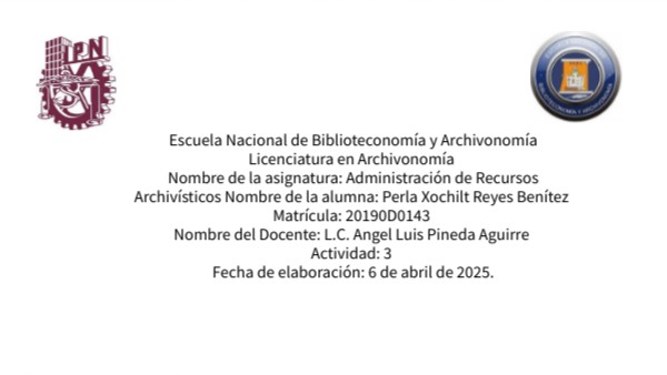 Escuela Nacional de Biblioteconomía y ArchivonomíaLicenciatura en Archivonomía Nombre de la asignatura: Administración de Recursos Archivísticos Nombre de la alumna: Perla Xochilt Reyes Benítez Matrícula: 20190D0143 Nombre del Docente: L.C. Angel Luis Pineda Aguirre Actividad: 3 Fecha de elaboración: 6 de abril de 2025.