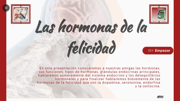 En esta presentación conoceremos a nuestras amigas las hormonas, sus funciones, tipos de hormonas, glándulas endocrinas principales, hablaremos someramente del sistema endocrino y los desequilibrios hormonales y para finalizar hablaremos brevemente de las hormonas de la felicidad que son la dopamina, serotonina, endorfina y la oxitocina.