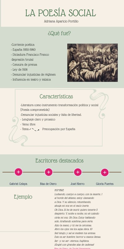 -Literatura como instrumento transformación política y social (Poesía comprometida) -Denunciar injusticias sociales y falta de libertad. - Lenguaje claro y prosaico - Verso libre - Tema Preocupación por España