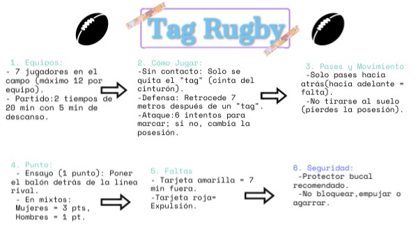 2. Cómo Jugar:-Sin contacto: Solo se quita el "tag" (cinta del cinturón). -Defensa: Retrocede 7 metros después de un "tag". -Ataque:6 intentos para marcar; si no, cambia la posesión.