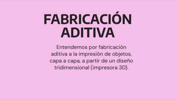Entendemos por fabricación aditiva a la impresión de objetos, capa a capa, a partir de un diseño tridimensional (impresora 3D).