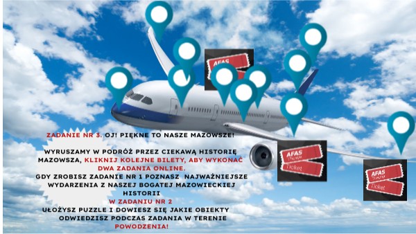 ZADANIE nr 3. OJ! PIĘKNE TO NASZE MAZOWSZE! Wyruszamy w podróż przez ciekawą historię mazowsza, Kliknij kolejne bilety, aby wykonać dwa zadania ONLINE. Gdy zrobisz zadanie nr 1 poznasz NAJWAŻNIEJSZE WYDARZENIA Z NASZEJ BOGATEJ MAZOWIECKIEJ HISTORII W zadaniu nr 2 UŁOŻYSZ PUZZLE I DOWIESZ SIĘ JAKIE OBIEKTY ODWIEDZISZ PODCZAS ZADANIA W TERENIE powodzenia!