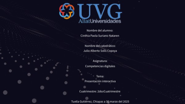 Nombre del alumno: Cinthia Paola Suriano Nataren Nombre del catedrático: Julio Alberto Solís Copoya Asignatura: Competencias digitales Tema: Presentación interactiva Cuatrimestre: 2do. Cuatrimestre Tuxtla Gutiérrez, Chiapas a 30 marzo del 2025