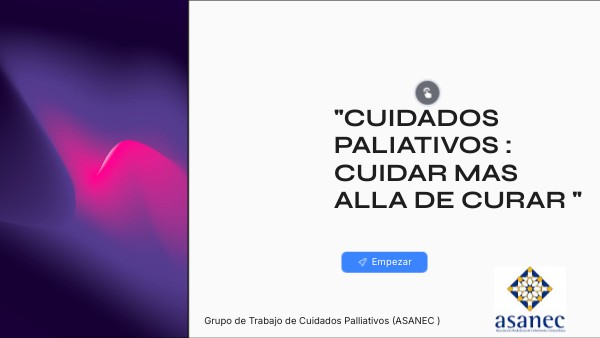 Este documento ha sido creado por el grupo de trabajo de Cuidados Paliativos de Asanec .Su objetivo es poder ayudaros en vuestro dia a dia con todas las personas con necesidades de cuidados paliativos . Esperamos que sea de vuestro agrado y facil de utilizar , tocar todos los elementos interactivos que encontreis para visualizar toda la informcion . Muchas gracias